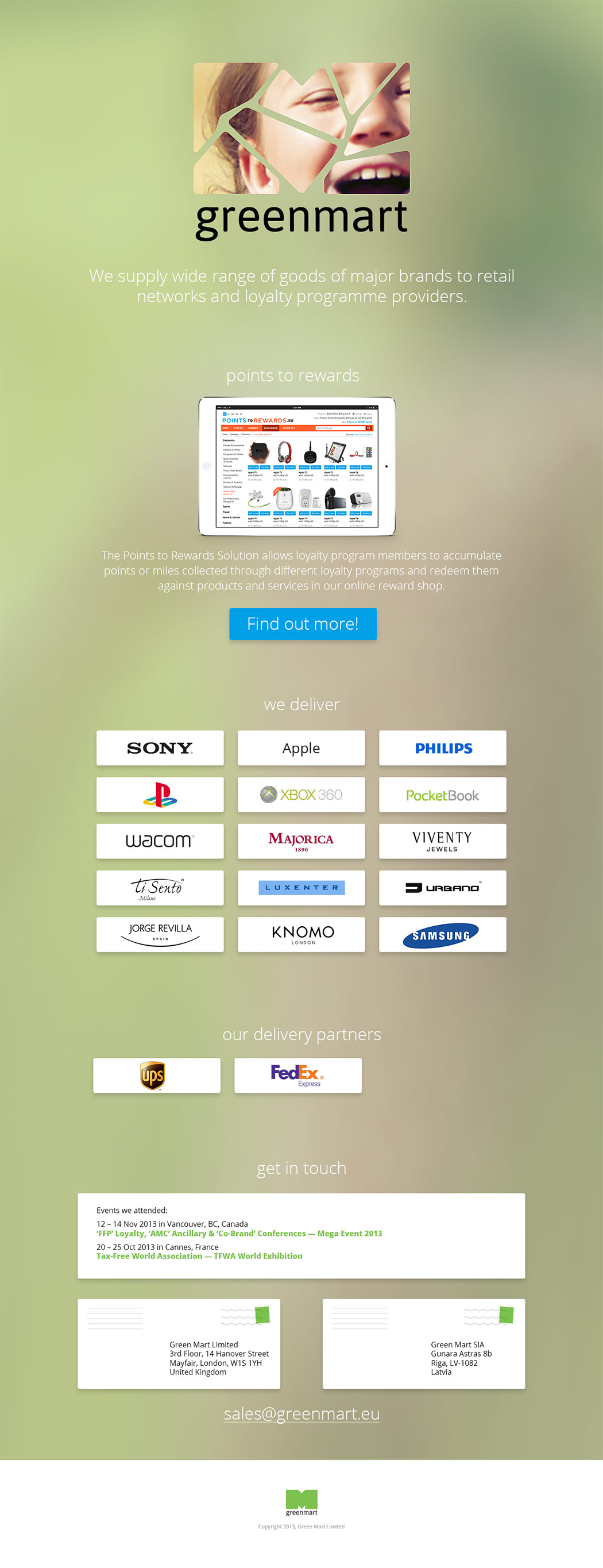 Greenmart supplies a wide range of major brand goods to retail networks and loyalty program providers. In lab9.pro we designed corporate identity, developed a website, some print materials and logic with system architecture of the company’s platform.